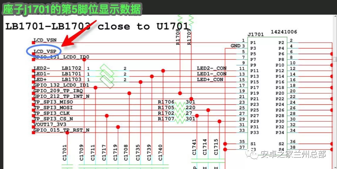 首先对地阻值法,测量J1701显示座子阻值。经检测发现第5脚 LCD-VSP信号对地短路。经查此线路的2个滤波电容C1733和C1723也对地短路,怀疑有滤波电容损坏导致的LDC-VSP信号对地,果断摘除C1733和C1723电容,再测量发现还是对地短路。接下来通过点位图发现LCD-VSP信号来自U1702(显示ic 型号:TPS65312A0),果断摘除U1702,发现该路无组织。到此基本确定U1702损坏,导致的不显示故障,更换新的显示ic 故障排除。